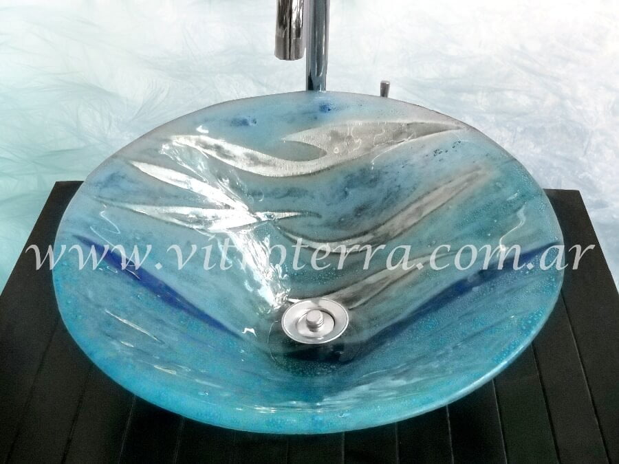 Bacha circular de vidrio El-Mar-de-la-Viuda. Realizada con la técnica de vitrofusión. El diseño de la bacha circular de vidrio El-Mar-de-la-Viuda puede ser adaptado (en algunos casos con algunas limitaciones) a otros formatos disponibles en nuestra web. Nuestras bachas de vidrio son productos totalmente artesanales, pintadas a mano, y pueden ser combinados con marcos para espejos, guardas y mesadas haciendo juego con la ellas. En este formato hay varias alternativa de medidas: bacha circular de vidrio 30 cm de diámetro x 10 cm de altura, o 35 cm de diámetro x 12 cm de altura y por último de 40 cm de diámetro x 12 cm de altura (dado que este es una bacha artesanal, puede haber ligeras diferencias en las medidas). Esta bacha circular de vidrio puede personalizarse, ya sea llevando el diseño a otros formatos, o bien cambiando sus colores para adaptarse al espacio en el que irán. Nuestros formatos son originales, dado que los moldes han sido desarrollados en exclusividad por otros artesanos para Vitroterra. Si quisieras un diseño a tu gusto, una vez confirmada tu compra puede ser desarrollado sin costo adicional. Enviándonos fotos de tu baño podemos asesorarte en cuanto a colores y formatos para que tu baño sea el que siempre soñaste. Hacemos envíos tanto al interior como al exterior del país. Los envíos se hacen en cajas de madera de exportación reutilizables, por lo cual tienen un costo adicional. Todas nuestras bachas vienen con su jabonera haciendo juego de regalo. Si quisieras consultarnos por favor envíanos tu mensaje al 0054911 4449-2736, clickeando en el ícono de Whatsapp ya que por este medio podemos intercambiar fotos más fácilmente y te podré responder más rápidamente. Si quisieras imaginar como queda un producto Vitroterra ambientado, visitá en este sitio el sector Ambientación, donde podrás ver fotos de nuestros productos instalados en los baños de nuestros clientes.