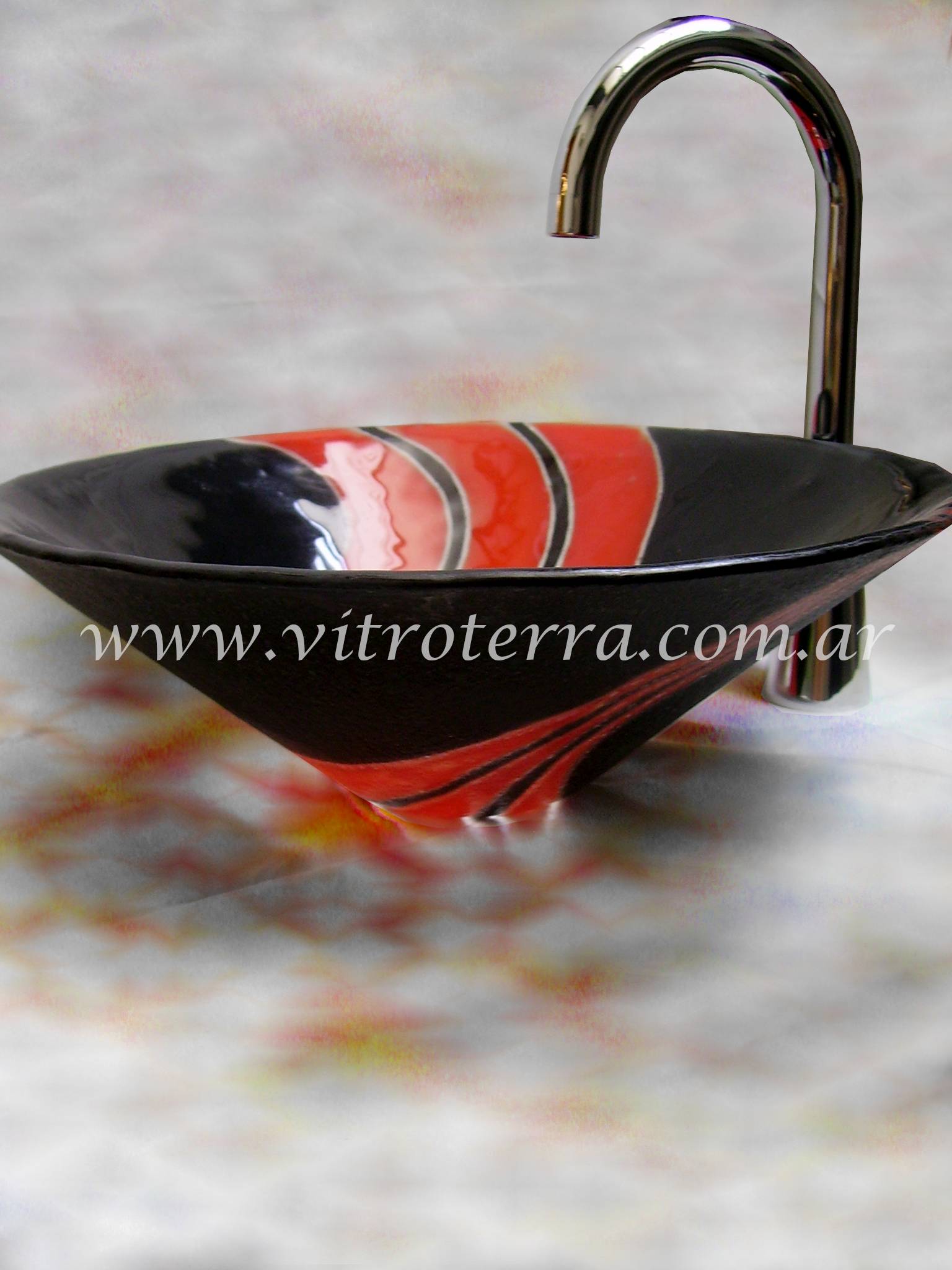 Bacha circular de vidrio Sinuosa.  Realizada con la técnica de vitrofusión.  El diseño de la bacha circular de vidrio Sinuosa  puede ser adaptado (en algunos casos con algunas limitaciones) a otros formatos disponibles en nuestra web. Nuestras bachas de vidrio son productos totalmente artesanales, pintadas a mano, y pueden ser combinados con marcos para espejos, guardas  y mesadas haciendo juego con ellas.  En este formato hay varias alternativas de medidas: bacha circular de vidrio 30 cm de diámetro x 10 cm de altura, o  35 cm  de diámetro x 12 cm de altura y por último de 40 cm de diámetro x 12 cm de altura (dado que este es una bacha artesanal, puede haber ligeras diferencias en las medidas).  Esta bacha circular de vidrio puede personalizarse, ya sea llevando el diseño a otros formatos, o bien cambiando sus colores para adaptarse al espacio en el que irán. Nuestros formatos son originales, dado que los moldes han sido desarrollados en exclusividad por otros artesanos para Vitroterra.  Si quisieras un diseño a tu gusto,  una vez confirmada tu compra puede ser desarrollado sin costo adicional.  Enviándonos fotos de tu baño podemos asesorarte en cuanto a colores y formatos para que tu baño sea el que siempre soñaste. Hacemos envíos tanto al interior como al exterior del país.  Los envíos se hacen en cajas de madera de exportación reutilizables, por lo cual tienen un costo adicional.  Todas nuestras bachas vienen con su jabonera haciendo juego de regalo.  Si quisieras consultarnos por favor envíanos tu mensaje al 0054911 4449-2736, clickeando en el ícono de Whatsapp ya que por este medio podemos intercambiar fotos más fácilmente y te podré responder más rápidamente.  Si quisieras imaginar como queda un producto Vitroterra ambientado, visitá en este sitio el sector Ambientación, donde podrás ver fotos de nuestros productos instalados en los baños de nuestros clientes.