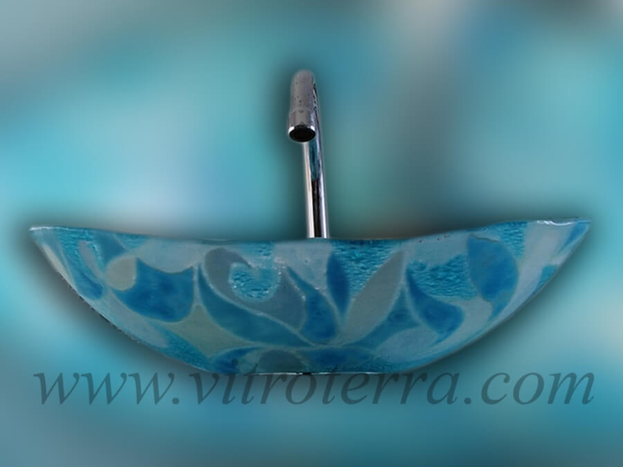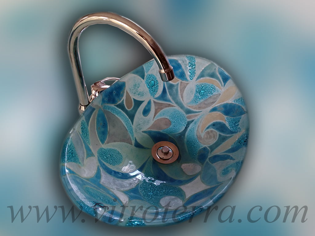 Bacha oval de vidrio Ian. Realizada con la técnica de vitrofusión. El diseño de la bacha oval de vidrio Ian puede ser adaptado (en algunos casos con algunas limitaciones) a otros formatos disponibles en nuestra web. Nuestras bachas de vidrio son productos totalmente artesanales, pintadas a mano, y pueden ser combinados con marcos para espejos, guardas y mesadas haciendo juego con ellas. En el formato oval hay dos alternativas de medidas: las bachas ovaladas que miden 30 cm x 41 cm x 10 cm de altura en las puntas y las bachas ovaladas bote que miden 30 cm x 52 cm x 10 cm de altura. Estas bachas ovales de vidrio pueden personalizarse, ya sea llevando el diseño a otros formatos, o bien cambiando sus colores para adaptarse al espacio en el que irán. Son bachas ideales para espacios angostos, pero brindan muchísima funcionalidad ya que al ser alargadas siguen el formato de las manos en posición de lavado, evitando salpicaduras. El formato de esta bacha de vidrio es único, dado que el molde fue desarrollado en exclusividad por otros artesanos para Vitroterra. Si quisieras un diseño a tu gusto, una vez confirmada tu compra puede ser desarrollado sin costo adicional. Enviándonos fotos de tu baño podemos asesorarte en cuanto a colores y formatos para que tu baño sea el que siempre soñaste. Hacemos envíos tanto al interior como al exterior del país. Los envíos se hacen en cajas de madera de exportación reutilizables, por lo cual tienen un costo adicional. Todas nuestras bachas vienen con su jabonera haciendo juego de regalo. Si quisieras consultarnos por favor envíanos tu mensaje al 0054911 4449-2736, clickeando en el ícono de Whatsapp ya que por este medio podemos intercambiar fotos más fácilmente y te podré responder más rápidamente. Si quisieras imaginar como queda un producto Vitroterra ambientado, visitá en este sitio el sector Ambientación, donde podrás ver fotos de nuestros productos instalados en los baños de nuestros clientes.