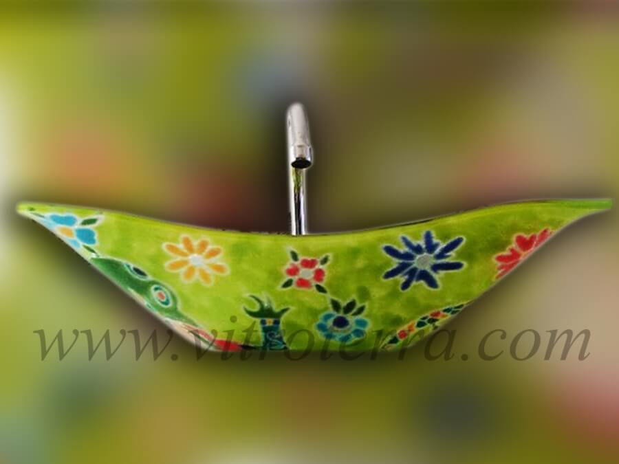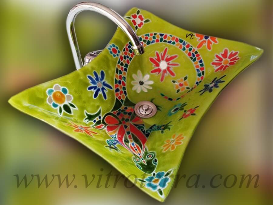 Bacha rectangular de vidrio Iguana. Realizada con la técnica de vitrofusión. El diseño de la bacha rectangular de vidrio Iguana puede ser adaptado (en algunos casos con algunas limitaciones) a otros formatos disponibles en nuestra web. Nuestras bachas de vidrio son productos totalmente artesanales, pintadas a mano, y pueden ser combinados con marcos para espejos, guardas y mesadas haciendo juego con ellas. En este formato rectangular las medidas son 38 x 47, miden entre 14 y 15 cm en las puntas y entre 12 y 13 cm en el centro. Estas bachas rectangulares de vidrio pueden personalizarse, ya sea llevando el diseño a otros formatos, o bien cambiando sus colores para adaptarse al espacio en el que irán. Dentro de nuestros formatos es uno de los más vendidos, ya que combinan una superficie de apoyo pequeña (10 cm x 20 cm) con un espacio amplio en sus bordes, esto permite maximizar el uso de las mesadas. El formato de esta bacha de vidrio es único, dado que el molde fue desarrollado en exclusividad por otros artesanos para Vitroterra. Si quisieras un diseño a tu gusto, una vez confirmada tu compra puede ser desarrollado sin costo adicional. Enviándonos fotos de tu baño podemos asesorarte en cuanto a colores y formatos para que tu baño sea el que siempre soñaste. Hacemos envíos tanto al interior como al exterior del país. Los envíos se hacen en cajas de madera de exportación reutilizables, por lo cual tienen un costo adicional. Todas nuestras bachas vienen con su jabonera haciendo juego de regalo. Si quisieras consultarnos por favor envíanos tu mensaje al 0054911 4449-2736, clickeando en el ícono de Whatsapp ya que por este medio podemos intercambiar fotos más fácilmente y te podré responder más rápidamente. Si quisieras imaginar como queda un producto Vitroterra ambientado, visitá en este sitio el sector Ambientación, donde podrás ver fotos de nuestros productos instalados en los baños de nuestros clientes.