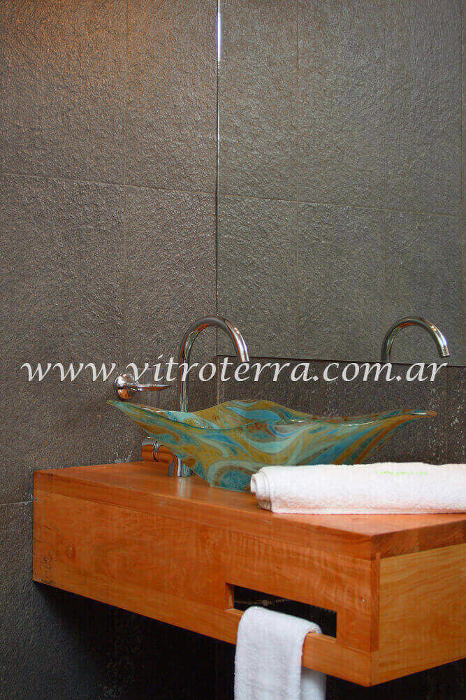 Bacha rectangular de vidrio Isla. Realizada con la técnica de vitrofusión. El diseño de la bacha rectangular de vidrio Isla puede ser adaptado (en algunos casos con algunas limitaciones) a otros formatos disponibles en nuestra web. Nuestras bachas de vidrio son productos totalmente artesanales, pintadas a mano, y pueden ser combinados con marcos para espejos, guardas y mesadas haciendo juego con ellas. En este formato rectangular las medidas son 38 x 47, miden entre 14 y 15 cm en las puntas y entre 12 y 13 cm en el centro. Estas bachas rectangulares de vidrio pueden personalizarse, ya sea llevando el diseño a otros formatos, o bien cambiando sus colores para adaptarse al espacio en el que irán. Dentro de nuestros formatos es uno de los más vendidos, ya que combinan una superficie de apoyo pequeña (10 cm x 20 cm) con un espacio amplio en sus bordes, esto permite maximizar el uso de las mesadas. El formato de esta bacha de vidrio es único, dado que el molde fue desarrollado en exclusividad por otros artesanos para Vitroterra. Si quisieras un diseño a tu gusto, una vez confirmada tu compra puede ser desarrollado sin costo adicional. Enviándonos fotos de tu baño podemos asesorarte en cuanto a colores y formatos para que tu baño sea el que siempre soñaste. Hacemos envíos tanto al interior como al exterior del país. Los envíos se hacen en cajas de madera de exportación reutilizables, por lo cual tienen un costo adicional. Todas nuestras bachas vienen con su jabonera haciendo juego de regalo. Si quisieras consultarnos por favor envíanos tu mensaje al 0054911 4449-2736, clickeando en el ícono de Whatsapp ya que por este medio podemos intercambiar fotos más fácilmente y te podré responder más rápidamente. Si quisieras imaginar como queda un producto Vitroterra ambientado, visitá en este sitio el sector Ambientación, donde podrás ver fotos de nuestros productos instalados en los baños de nuestros clientes.