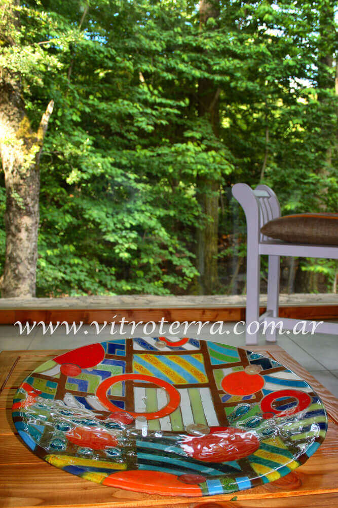 Centro circular de vidrio Kalasur. Realizado con la técnica de vitrofusión en 50 cm de diámetro. El diseño del centro circular de vidrio Kalasur puede ser adaptado a otros productos que se encuentran en nuestra web. Nuestros centros de mesa circulares de vidrio son productos totalmente artesanales, pintados a mano y en algunos casos incorporan detalles de diferentes metales o vidrios especiales de colores que los hacen únicos. Este centro de mesa puede hacerse en distintos diámetros hasta 55 cm, teniendo en cuenta que para adaptarlo a los distintos diámetros pueden ser necesario realizar algunas diferencias en el diseño. También se puede personalizar cambiando sus colores de acuerdo al ambiente en el que irá. El formato de este centro de mesa es único ya que fue desarrollado en exclusividad por otros artesanos para Vitroterra. Si quisieras un diseño a tu gusto, una vez confirmada tu compra puede ser desarrollado sin costo adicional. Enviándonos fotos del espacio en el que irá, podemos asesorarte en cuanto a colores y formatos para que quede como siempre soñaste. Ideal para regalos especiales y exclusivos, podemos diseñar un centro de mesa para momentos y personas únicas. Hacemos envíos tanto al interior como al exterior del país. El embalaje para su envío tiene costo, ya que se hace a medida para cada pieza. Si quisieras consultarnos por favor envíanos tu mensaje al 0054911 4449-2736, clickeando en el ícono de Whatsapp ya que por este medio podemos intercambiar fotos más fácilmente y te podré responder más rápidamente. Si quisieras imaginar como queda un producto Vitroterra ambientado, visitá en este sitio el sector Ambientación, donde podrás ver fotos de algunos de nuestros productos en casa de nuestros clientes. Por favor, tener en cuenta que algunos de nuestros centros de mesa pueden ser piezas únicas, podemos realizar diseños similares pero no exactamente los mismos.